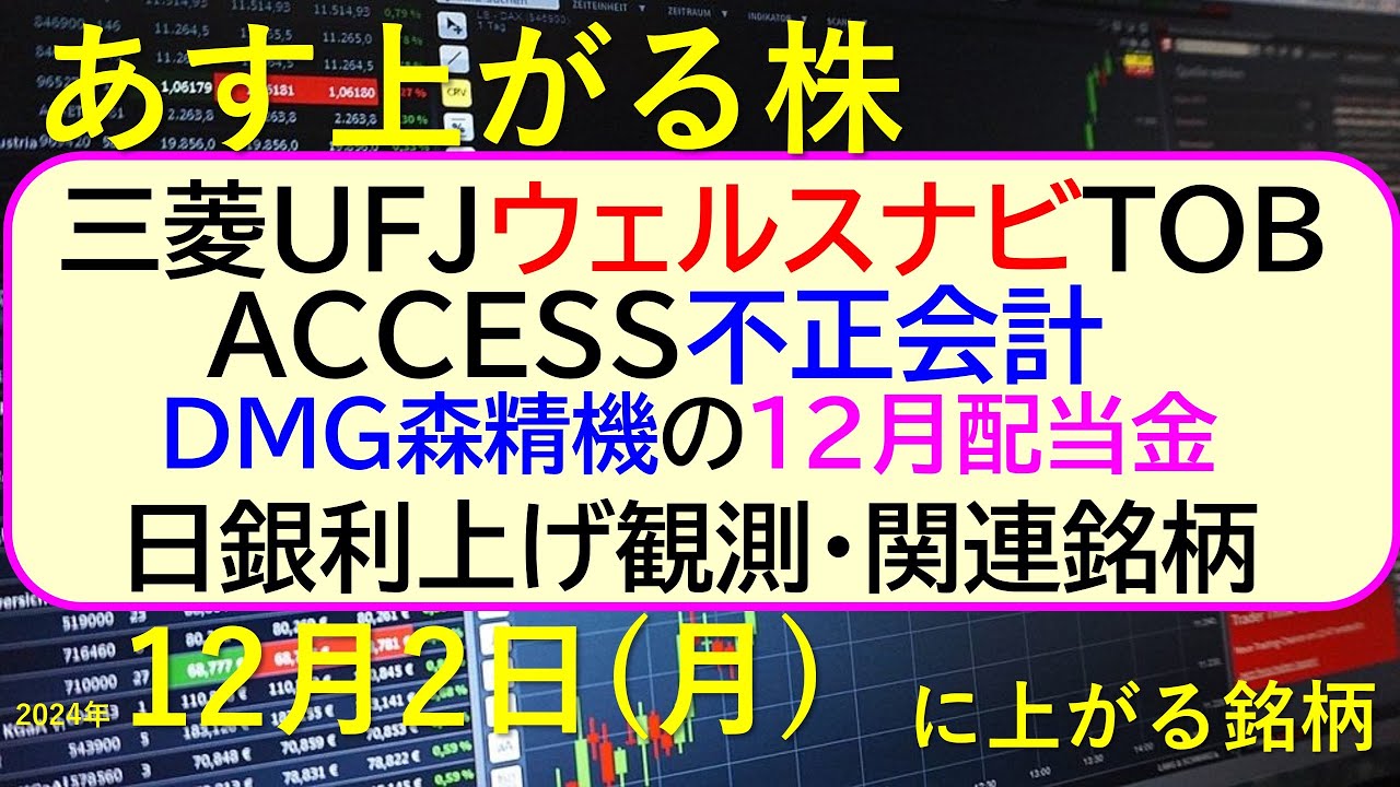 今日の引け後に出た材料で、週明け12/2(月)に期待できる銘柄。日銀の利上げ観測。三菱UFJがウェルスナビTOB。ACCESSは不正会計、ファナックは品質不正。~あす上がる株。最新の日本株情報。高配当株の株価やデイトレ情報についてもお話しいたします。