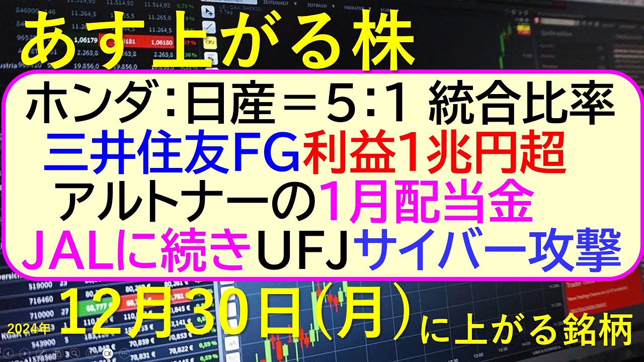 あす上がる株 2024年12月30日(月)に上がる銘柄。ホンダと日産の統合比率。JALに続きUFJサイバー攻撃。三井住友利益1兆円超。アルトナーの配当~最新の日本株情報。高配当株の株価やデイトレ情報~