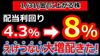 【超高配当!配当利回り 8 %!えげつない大増配きた!】1/31(金)に株価が上がる株・明日上がる株・株式投資日本株最新情報