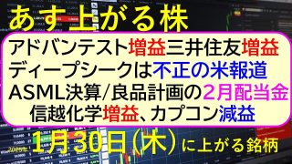 今日の引け後に出た材料で、あす1/30(木)に期待できる銘柄。アドバンテスト増益、三井住友増益、信越化学増益、カプコン減益。ディープシークの不正報道。ASML決算。良品計画の2月配当金。~あす上がる株。最新の日本株情報。高配当株の株価やデイ...