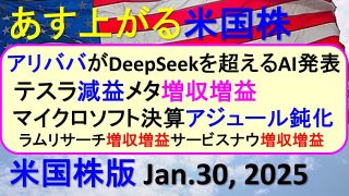 米国株の株式投資。DeepSeekを超えるアリババのAI。テスラ、メタ、マイクロソフト決算FOMC~あす上がる株米国版。Jan.30, 2025。最新のアメリカ株価と株式投資。高配当株やデイトレ情報も