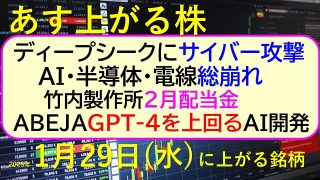 あす上がる株 2025年1月29日(水)に上がる銘柄。ディープシークにサイバー攻撃。ABEJAGPT-4を上回るAIを開発。DeepSeekショック~最新の日本株情報。高配当株の株価やデイトレ情報~